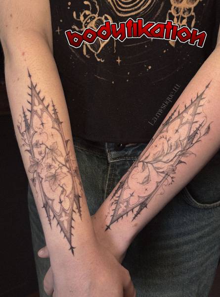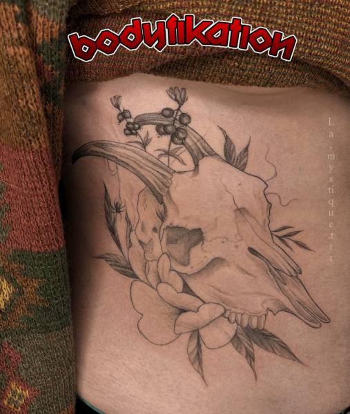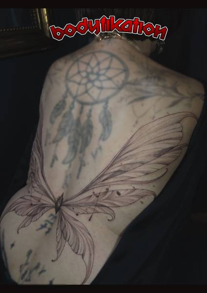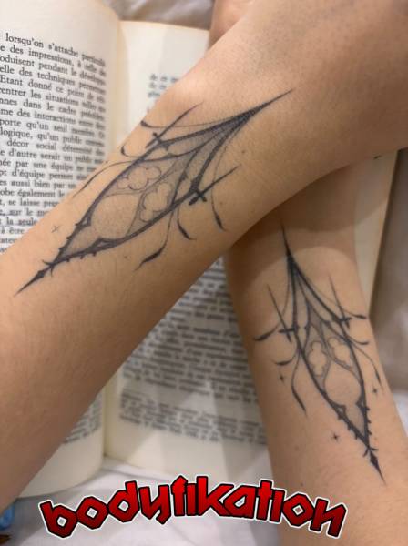 Elle adore également travailler des motifs de tatouages ésotériques, en lignes fines et élégantes, avec une douceur dans le traitement, un remplissage très léger.