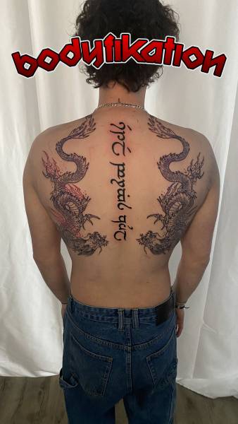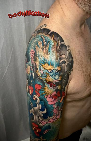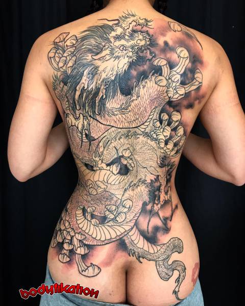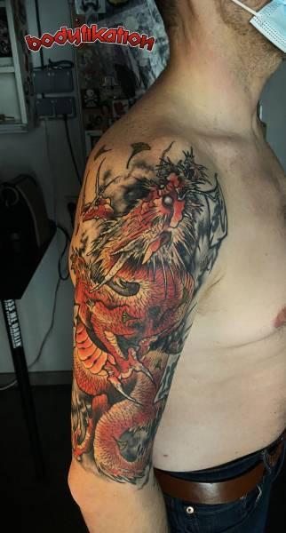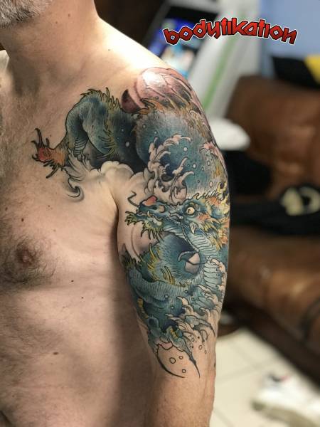 on peut se faire tatouer un dragon japonais, appelé RYU , en couleur ou noir et gris.